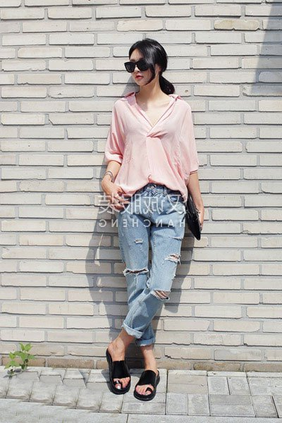 玫红色t恤型比较宽松,穿上去多少师气感,打上去玫红色带去的柔美气场,别有一个番口味,v领装修设计没经意地多了多少精致,组合搭配烂洞牛仔裤子裤穿上去街上潮范儿,极高时尚设计感。